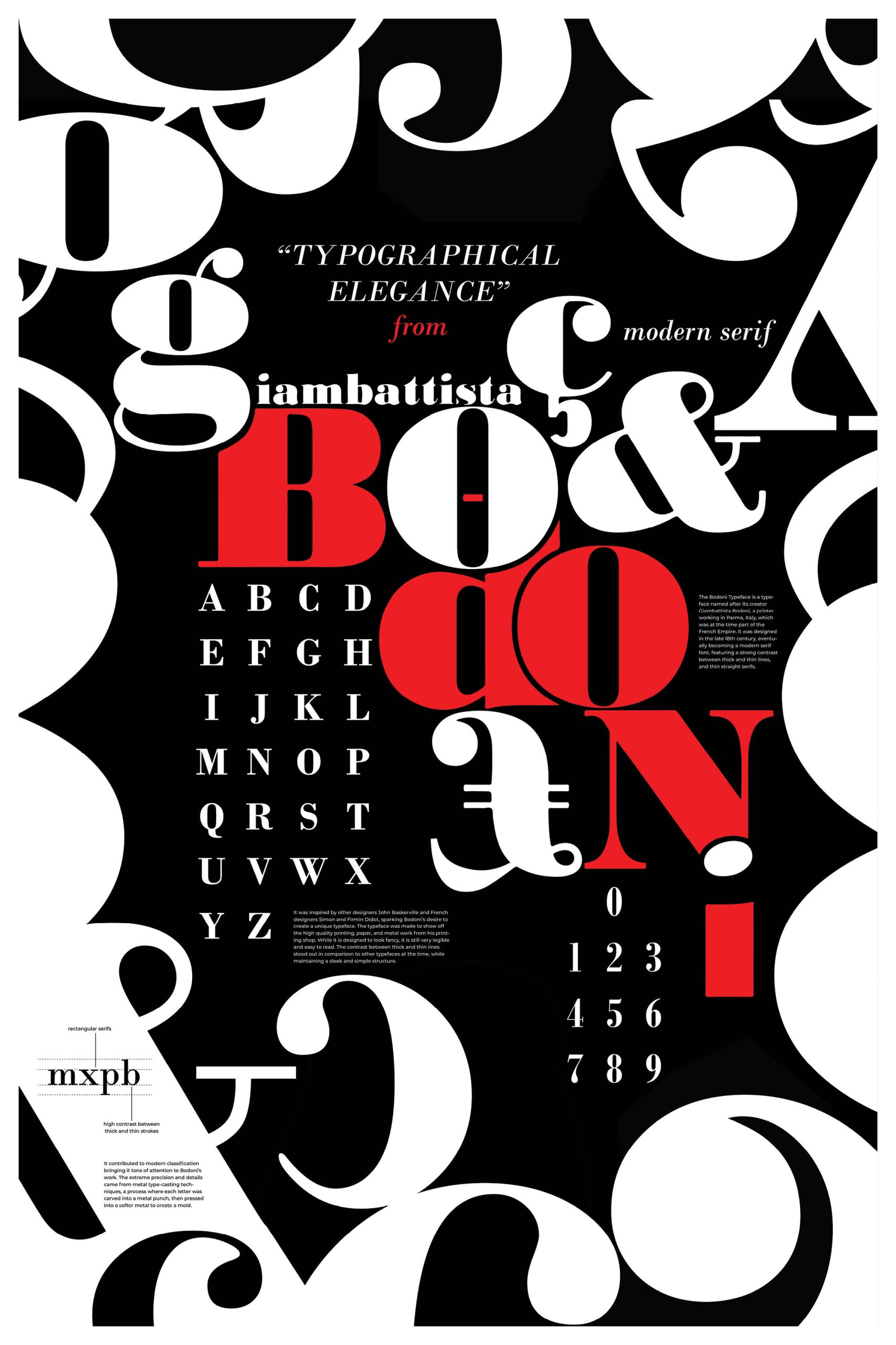 This poster was designed to pay homage to type designer Giambattista Bodoni. This poster celebrates the history of Bodoni and educates the viewer about the typeface’s history and gridding. The poster’s composition is dictated by the geometry of the letterforms. This poster was made as a vector art in Adobe Illustrator.